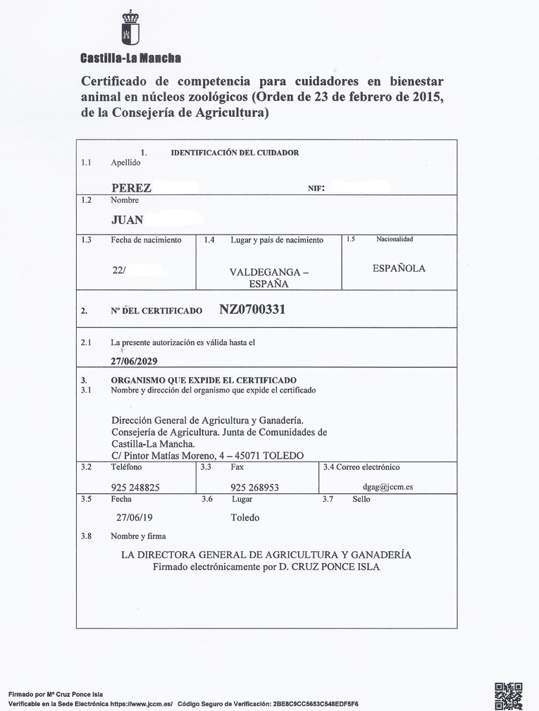Además, con la nueva actualización de la ley de núcleos zoológicos, es imprescindible que el titular del núcleo demuestre su competencia y conocimientos necesarios para estar al cuidado de los animales, por medio de un examen, con el que se obtiene el certificado correspondiente emitido por la consejeria correspondiente de la comunidad autónoma.